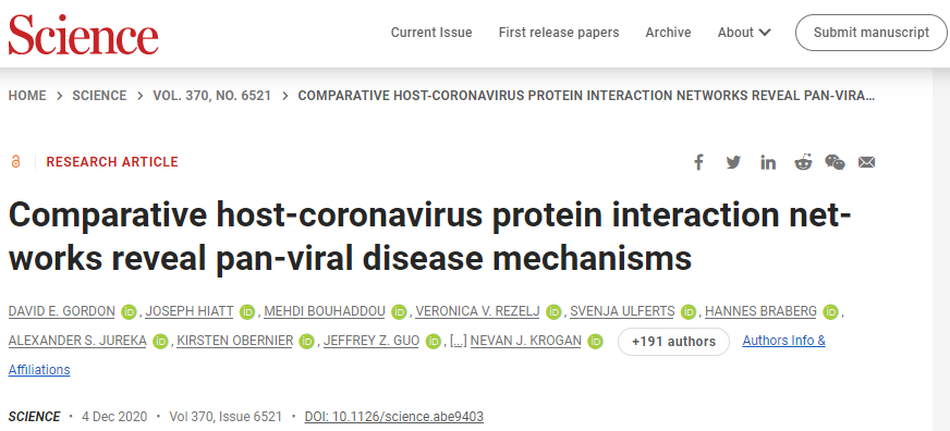 1. Gordon, D., Hiatt, J., Bouhaddou, M. et al. Comparative host-coronavirus protein interaction networks reveal pan-viral disease mechanisms. Science, 370, 6521 (2020). https://www.science.org/doi/10.1126/science.abe9403#F5