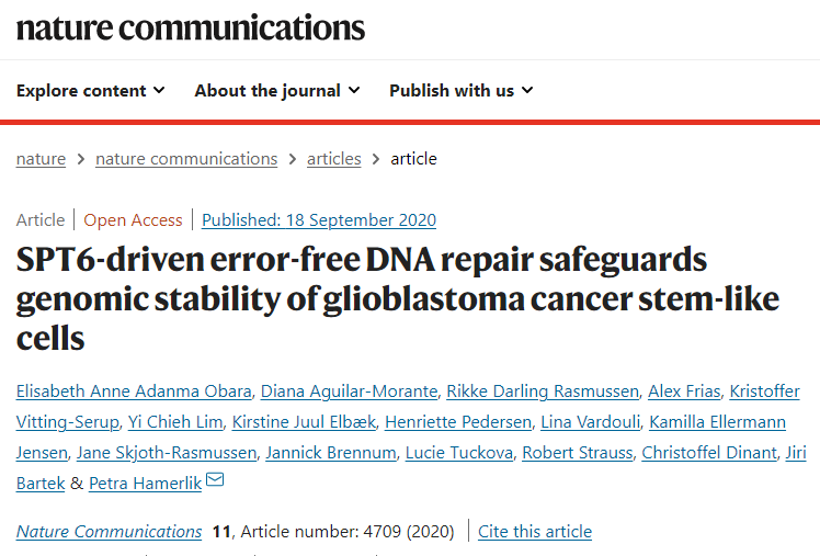 3. Obara, E.A.A., Aguilar-Morante, D., Rasmussen, R.D. et al. SPT6-driven error-free DNA repair safeguards genomic stability of glioblastoma cancer stem-like cells. Nat Commun 11, 4709 (2020). https://doi.org/10.1038/s41467-020-18549-8