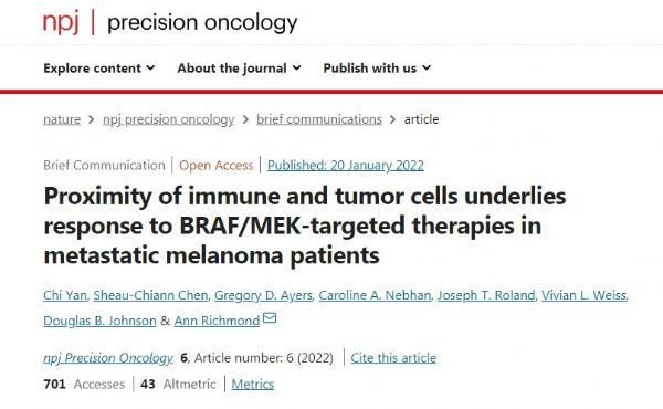 2022年3月7日报道,近日,一篇发表在国际杂志npj Precision Oncology上题为“Proximity of immune and tumor cells underlies response to BRAF/MEK-targeted therapies in metastatic melanoma patients”的研究报告中,来自范德堡大学医学中心等机构的科学家们通过研究揭示了黑色素瘤对疗法产生耐药性的新型机制。