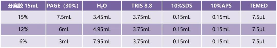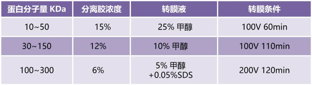 根据目标蛋白分子量大小、表达位置和样本数量确定分离胶和浓缩胶浓度、凝胶厚度和数量。