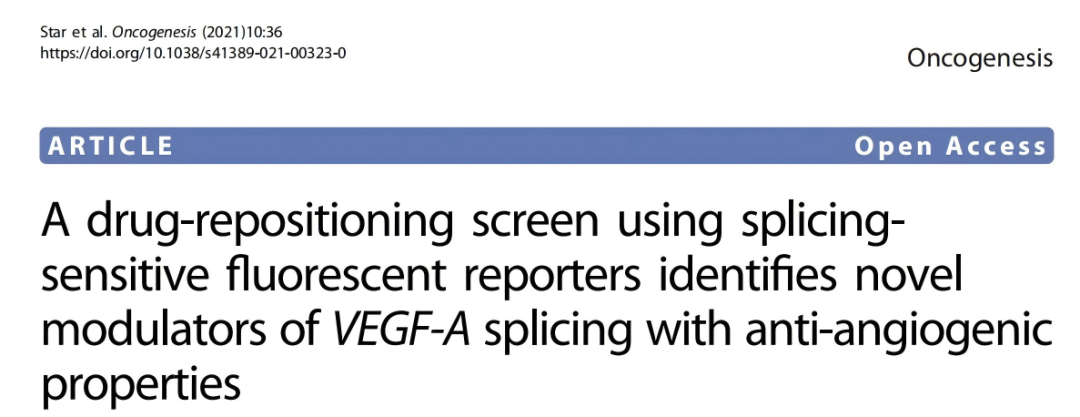 Star E, Stevens M,Gooding C, et al. A drug-repositioning screen using splicing-sensitive fluorescent reporters identifies novel modulators of VEGF-A splicing with anti-angiogenic properties[J]. Oncogenesis,2021,10(5): 36.