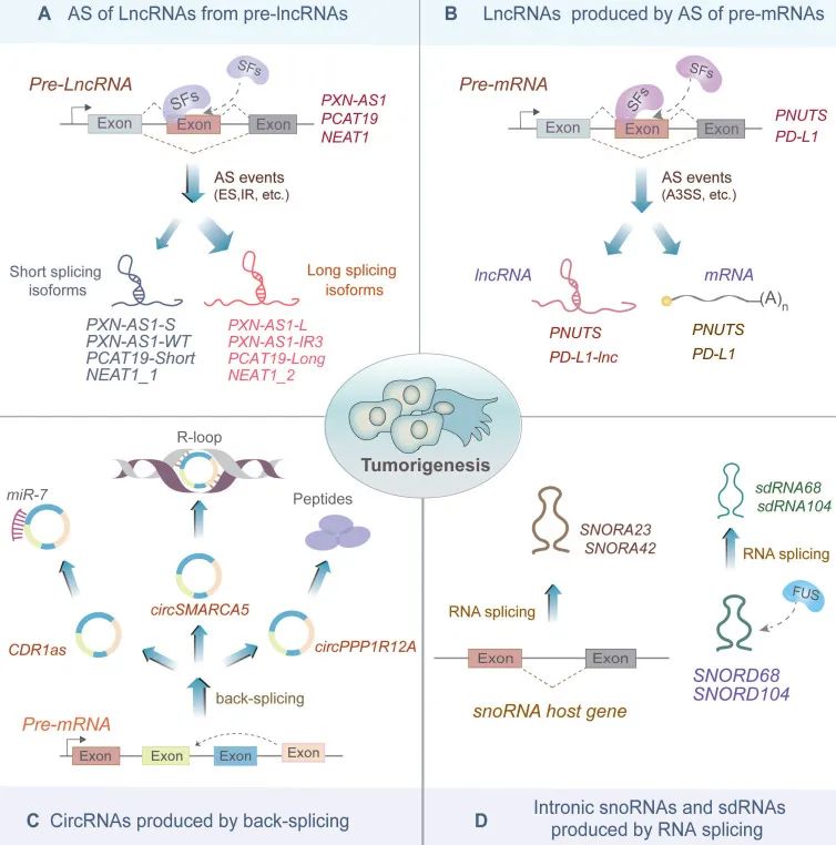 有学者指出,异常AS的出现可作为疾病诊断的生物标志物,并用作新型治疗解决方案的新目标。该领域的许多研究都集中在PCG上,但鉴于lncRNA的重要生物学功能,特定lncRNA剪接变体的异常表达最近受到越来越多的研究关注。据报道,由于致癌或基因毒性应激导致的lncRNA基因异常AS调节,在包括各种肿瘤在内的多种疾病中特异性表达(图6)。