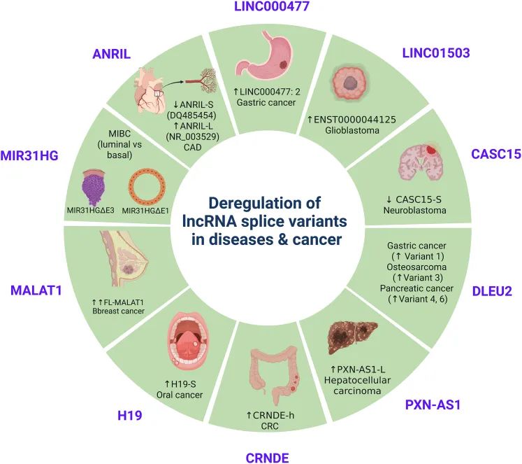 图6 LncRNA剪接变体在包括多种恶性肿瘤在内的多种疾病中失调的示例(Khan et al., 2023)。