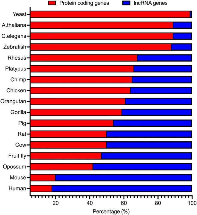图3 跨物种蛋白质编码基因(PCG)和lncRNA的相对百分比(Khan et al., 2023)。