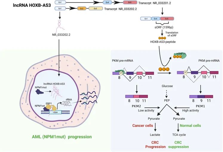 近年来的研究显示,lncRNA的差异AS事件可能会产生功能ORF,从而导致通过特定剪接变体产生小肽(图5)。如HOXB-AS3 lncRNA基因位点由5个外显子组成,可通过AS产生多种剪接变异体。其中两个已进行功能表征:NR_033201.2变体具有跨越外显子4和5的小ORF,编码53氨基酸长的微肽,这种微肽直接与hnRNPA1相互作用,调节PKM剪接。NR_033202.2剪接变体不编码这种微肽,但可通过增强核糖体RNA的转录来促进肿瘤细胞的增殖。