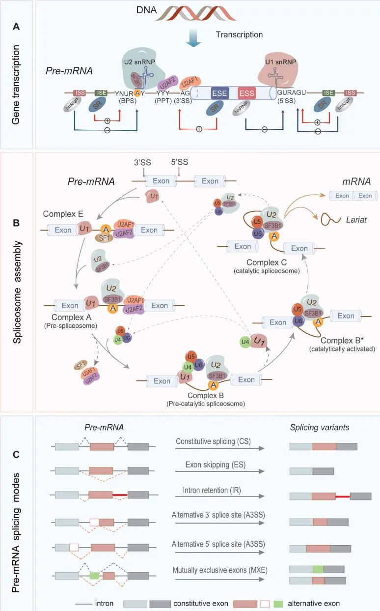 人类基因组计划发现人类基因组大约由22000个蛋白质编码基因组成,这些基因可通过可变剪接(Alternative Splicing,AS)产生多个转录本。介于AS是真核基因调控中常见且保守的过程,因此,RNA分子AS过程是转录组多样性的关键因素。RNA剪接是一个高度调控的过程,需要剪接体、顺式作用元件和反式作用蛋白之间的协调,最终从pre-mRNA中去除内含子,合并蛋白质编码外显子,以形成成熟的mRNA(图1)。具体而言,pre-mRNA内含子上包含三个重要位点,5'剪接位点(5'SS)、分支点位点(BPS)和3'剪接位点(3'SS),它们是短保守序列,以及一些其他的重要顺式作用元件,如内含子剪接增强子(ISE)和沉默子(ISS)、外显子剪接增强子(ESE)和沉默子(ESS)等(图1A)。在剪接过程中,剪接体(一种大型多聚体核糖核蛋白(RNP)复合物)的产生发挥重要作用(图1B)。之后,pre-mRNA分子经历各种剪接事件生成不同类型的AS,如:外显子跳跃(ES)、3'或5'剪接位点替代(A3SS或A5SS)、互斥外显子(MXE)、内含子保留(IR)等(图1C)。因此,pre-mRNA的AS事件可显著扩大转录组的复杂性,从而扩大蛋白质组的多样性。