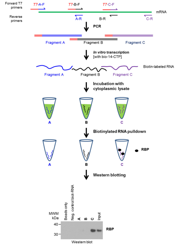 样品预处理—生物素探针标记RNA—RNA抽提—细胞裂解—磁珠富集RNA—RNA结合蛋白孵育—RNA结合蛋白洗脱—Western blot或LC-MS/MS检测