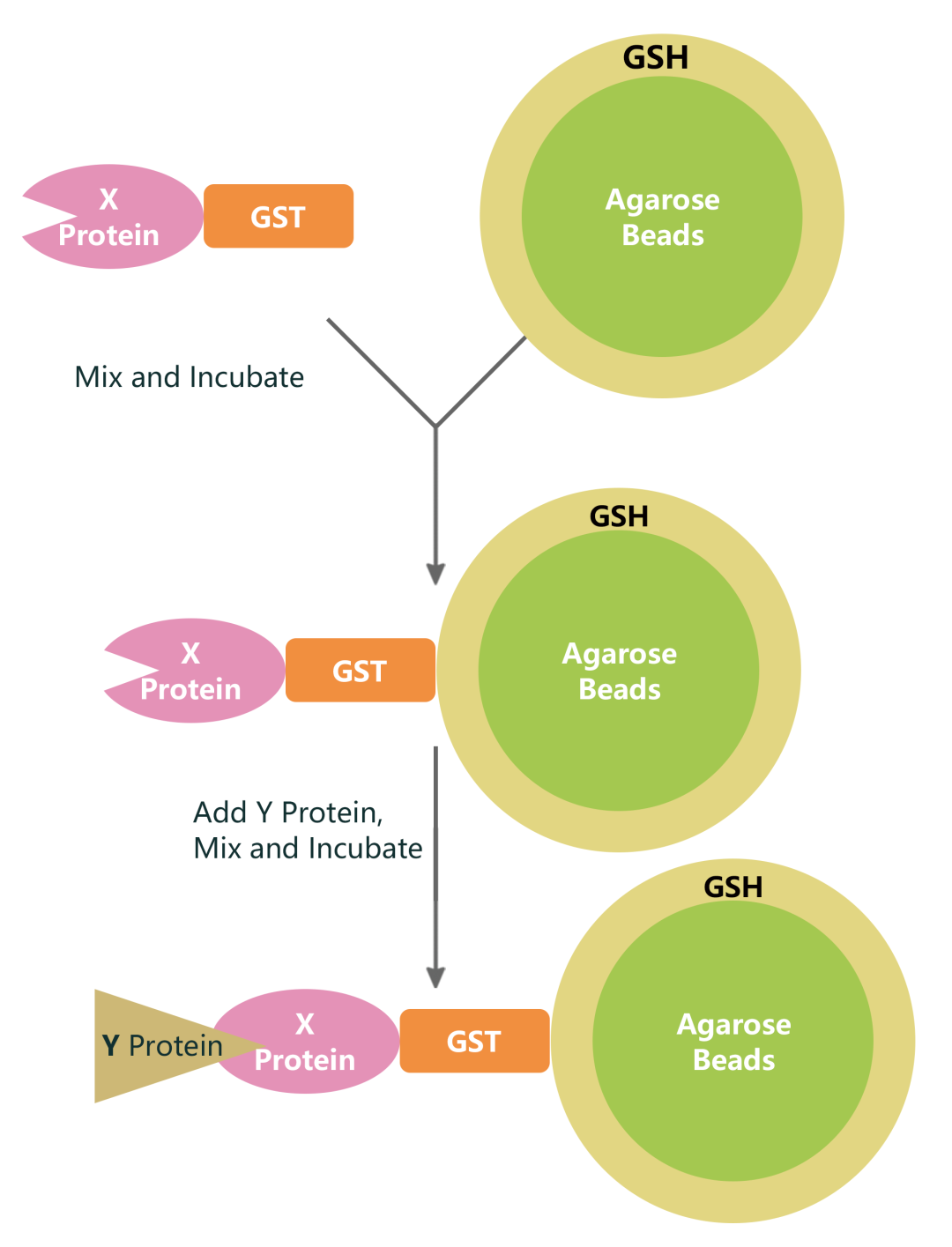 GST Pull-down的原理主要是利用GST对GSH的亲和性,将GSH固定于琼脂糖珠上,形成GSH-琼脂糖珠,再通过DNA重组技术将已知蛋白X与GST融合,GST-X融合蛋白与GSH-琼脂糖珠形成“琼脂糖珠-GSH-GST-X”复合物,若环境中存在与X蛋白互作的蛋白Y,则会形成“琼脂糖珠-GSH-GST-X-Y”复合物,与X蛋白互作的蛋白即可被分离并检测。