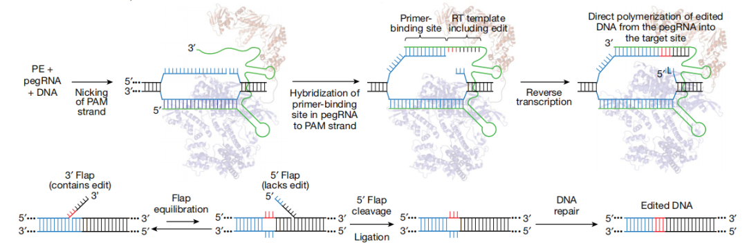 PE系统以CRISPR-Cas9系统为基础,包括pegRNA(Prime Editing Guide RNA)和融合蛋白两个核心部分,pegRNA是在sgRNA的基础上,在其3’末端增加了一段RNA序列,这段序列具有双重角色,一端作为逆转录引物结合位点(Primer Binding Site,PBS),另一端则是能与逆转录酶(RT)结合的逆转录模板(Reverse Transcriptase Templates,RTT),携带着认为设计的目标点突变或插入缺失突变;融合蛋白是将nCas9(H840A突变型,只切断含PAM的靶点DNA链)与逆转录酶融合获得的新型蛋白。