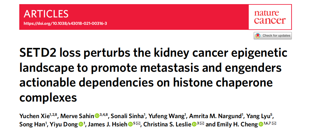 题目:SETD2缺失扰乱肾癌的表观遗传格局,促进转移,并产生对组蛋白伴侣复合物的可操作依赖性