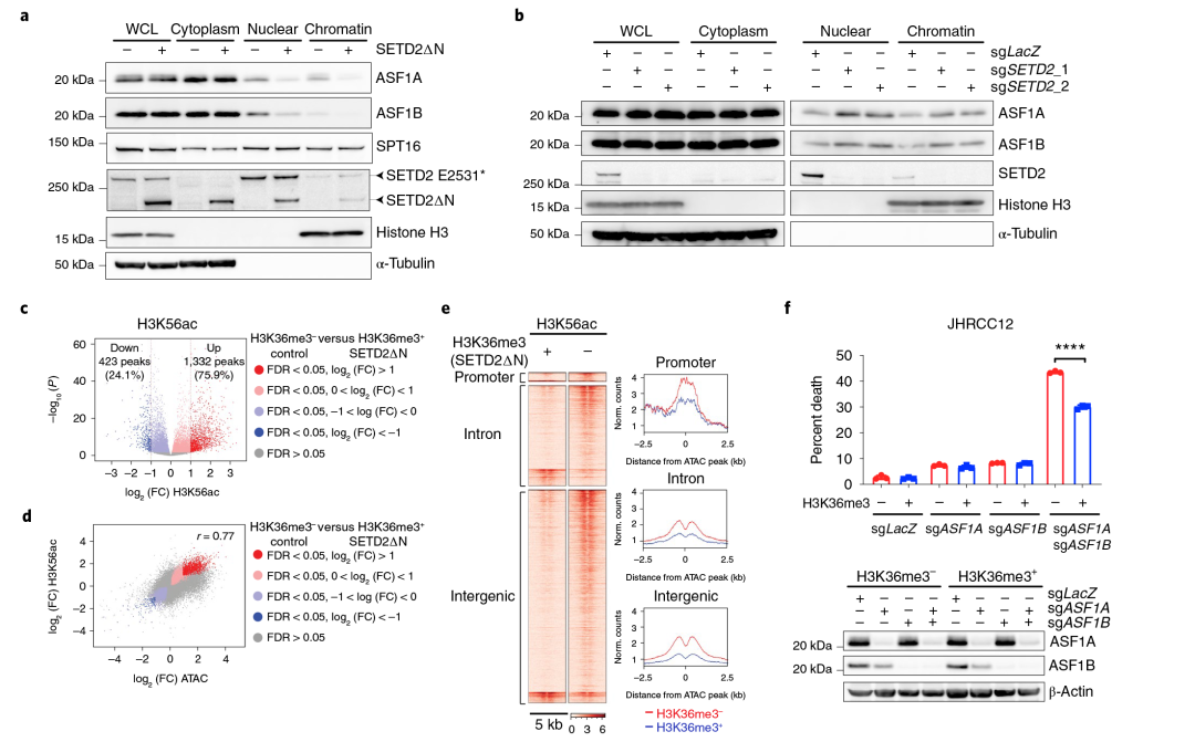 图5 SETD2介导的H3K36me3缺失增加组蛋白伴侣募集并使癌症细胞对组蛋白基因的失活敏感。(a)用免疫印迹法分析了JHRCC12细胞的WCLs和细胞质、细胞核和染色质组分;(b)用免疫印迹法分析了CAKI-2细胞的WCL和细胞质、细胞核和染色质组分;(c)火山图显示对照(H3K36me3−)和SETD2∆N转导(H3K36me3+)JHRCC12细胞中H3K56ac的ChIP-seq的变化;(d)H3K36me3−与H3K36me3+ JHRCC12细胞中H3K56ac ChIP-seq的log2(FC)和ATAC-seq的log2(FC)之间的相关性;(e)热图和超峰图显示H3K56ac ChIP-seq在ATAC-seq峰的相同区域的5kb窗口;(f)H3K36me3−和H3K36me3+(SETD2ΔN转导的)JHRCC12细胞经慢病毒CRISPR/cas9介导的ASF1 A(第1外显子)、ASF1 B或ASF1 A(第1外显子)和ASF1 B,并通过免疫印迹分析。