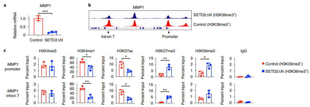 为了验证SETD2缺失介导的H3K36me3增加染色质可及性激活增强子,如何诱导基因参与转移?研究人员选择了一个肿瘤转移促进基因MMP1,通过CHIP-qPCR技术进行检测。结果表明,SETD2介导的H3K36me3的缺失增加了MMP1的染色质可及性和内含子增强子活性,从而诱导其表达,最终有助于肾癌的转移。