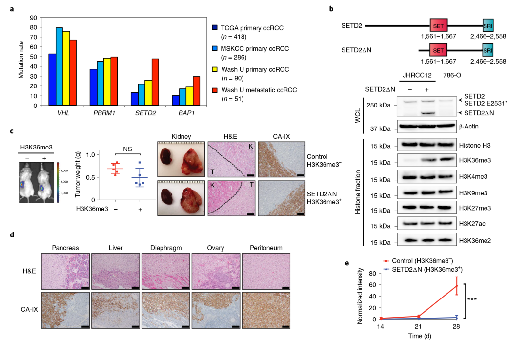 图1 SETD2在转移性ccRCC肿瘤中高度突变,并且SETD2MT ccRCC中H3K36me3的恢复抑制肿瘤转移。(a)VHL、PBRM1、SETD2和BAP1在上述ccRCC队列中的突变率;(b)SETD2和SETD2ΔN的结构域结构示意图;(c)将荧光素酶转导的JHRCC12细胞注射到NOD的单侧肾肾下囊中;(d)JHRCC12细胞的小鼠转移性肿瘤器官CA-IX的代表性HE染色和IHC染色;(e)在心内注射荧光素酶转导的JHRCC12细胞后,无胸腺裸鼠的生物发光图像。