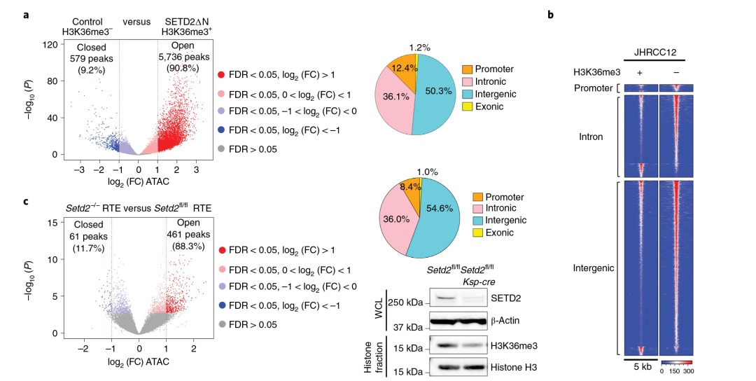 图2 SETD2介导的H3K36me3的缺失诱导染色质可及性的全基因组增加。(a)对照(H3K36me3-)与SETD2∆N转导(H3K36me3+)JHRCC12细胞的ATAC-seq peaks火山图;(b)ATAC-seq peaks在启动子、内含子和基因间区域的定位分组;(c)比较SETD2fl/flKsp-cre+小鼠与SETD2fl/fl小鼠培养的原代小鼠RTE细胞的ATAC-seq峰的火山图。