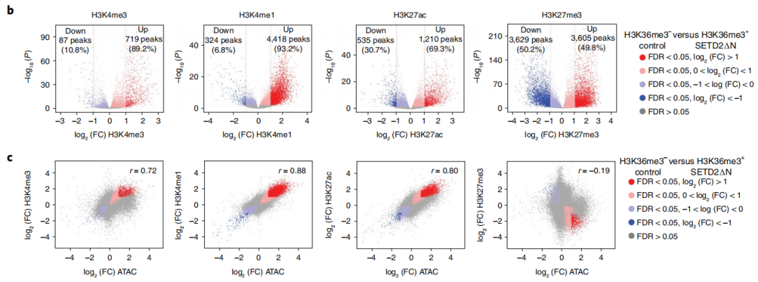 图3 SETD2介导的H3K36me3的缺失诱导全基因组表观遗传重编程和增强子的激活。(b)火山图显示了H3K36me3−与H3K36me3+ JHRCC12细胞的组蛋白修饰ChIP-seq变化;(c)散点图显示了H3K36me3−和H3K36seq每个组蛋白修饰的log2(FC)和H3K36me3+ JHRCC12细胞的ATAC-seq的log2(FC)之间的相关性。