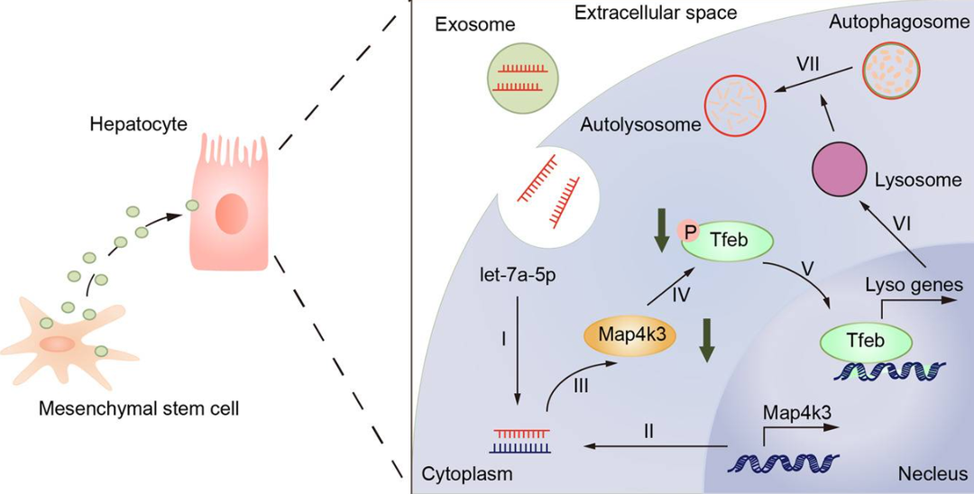 机制上,团队证实,富含let-7a-5p的MSCs外泌体(MSC-Exo)可通过靶向MAP4K3来激活自噬,降低TFEB磷酸化,并且敲除MAP4K3可缓解炎症反应,诱导自噬,部分减弱抗let-7a-5p寡核苷酸的作用(图1)。总体而言,MSCs的肝保护作用部分得益于其外泌体let-7a-5p介导的自噬修复,为ACLF治疗靶点提供了新的见解。