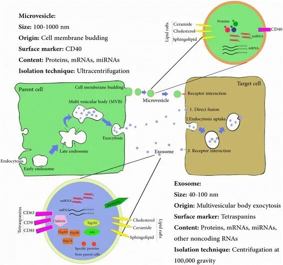 图2 细胞外囊泡来源、含量和细胞间通讯示意图(Keshtkar et al., 2018)。