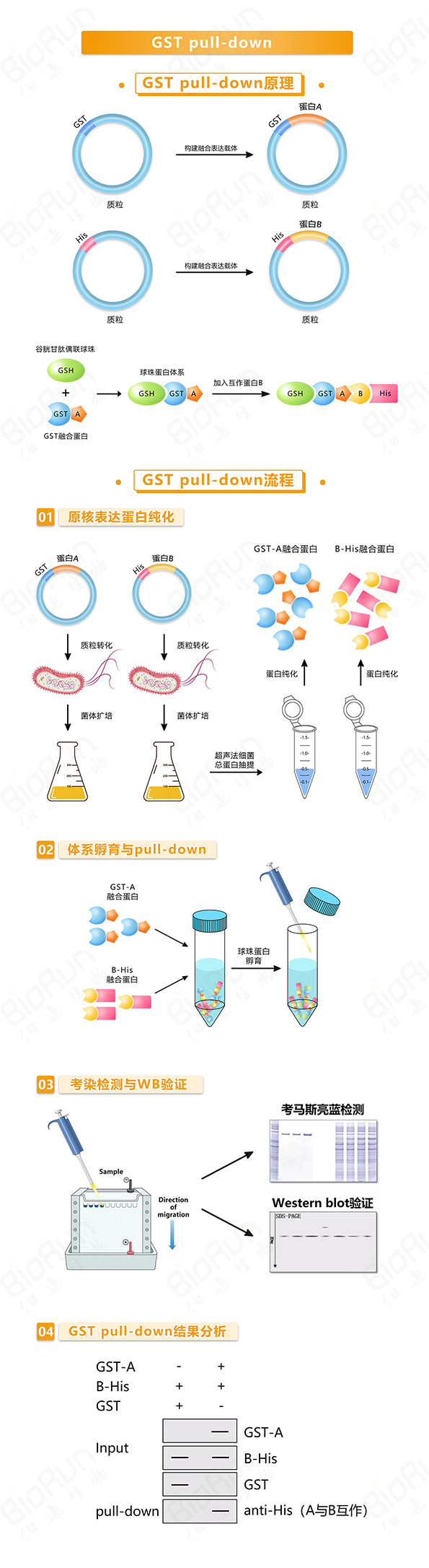客户在线下单——订单/实验材料确认——样品处理——GST/His-诱饵蛋白原核表达载体构建——原核表达——蛋白纯化——Pull-down捕获猎物蛋白——SDS-PAGE电泳——Western blot或LC-MS/MS