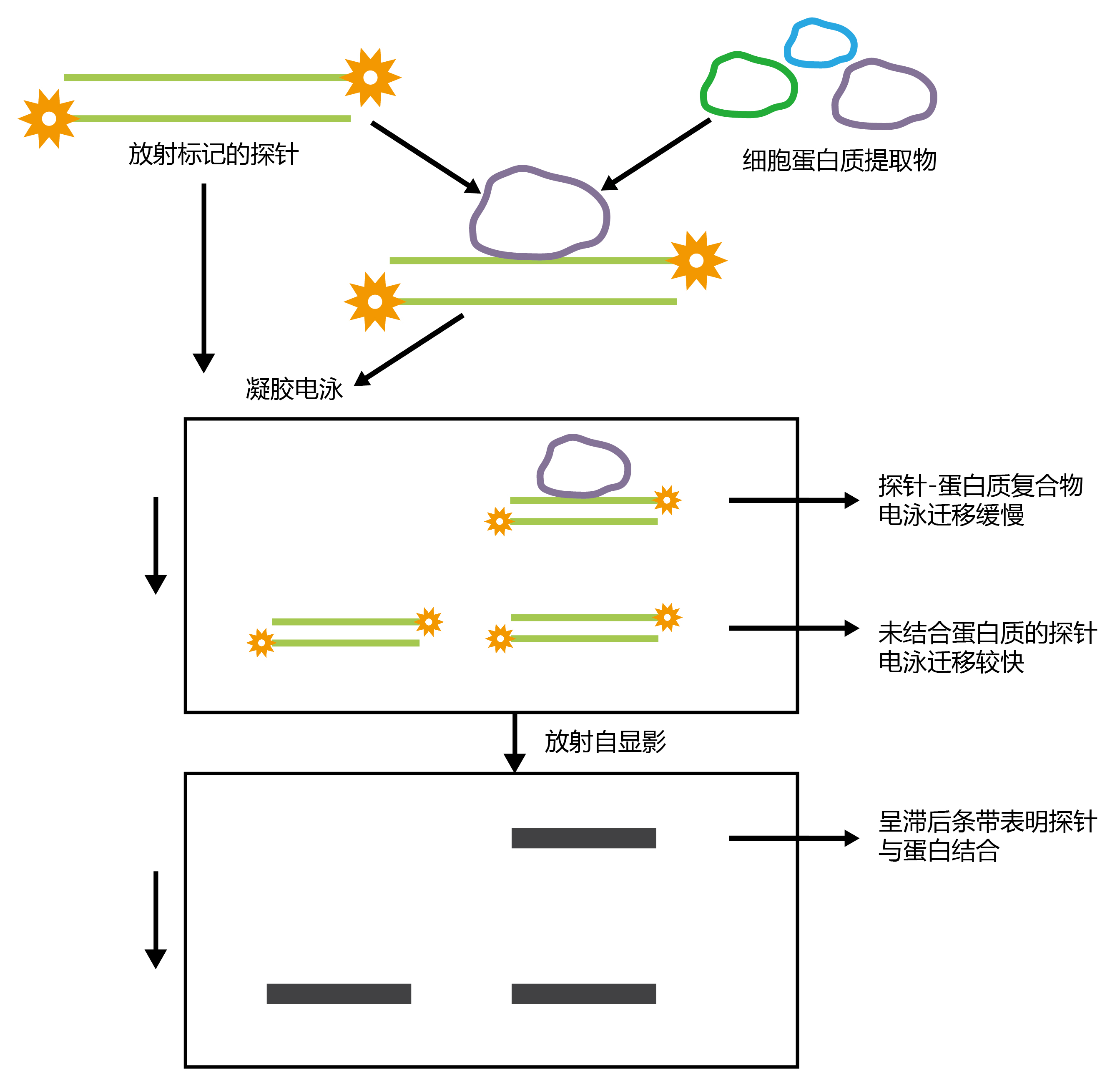 EMSA主要基于蛋白-探针复合物在在凝胶电泳过程中迁移较慢的原理。根据实验设计特异性和非特异性探针,当核酸探针与蛋白样本混合孵育时,样本中可以与核酸探针结合的蛋白质与探针形成蛋白-探针复合物,这种复合物由于分子量大,在进行PAGE电泳时迁移较慢,而没有结合蛋白的探针则迁移较快。孵育的样本在进行PAGE电泳并转膜后,蛋白-探针复合物会在膜靠前的位置形成一条带,说明有蛋白与目标探针发生互作。