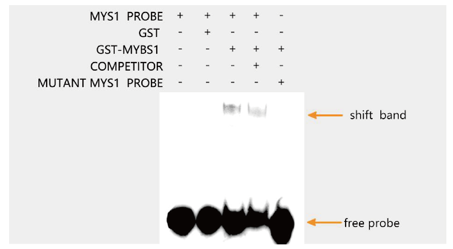 图 探针MYS1与蛋白GST-MYBS1有迁移条带,竞争型探针MYS1能够竞争掉部分探针MYS1与蛋白GST-MYBS1的迁移条带,突变型探针MYS1与蛋白GST-MYBS1没有迁移条带。
