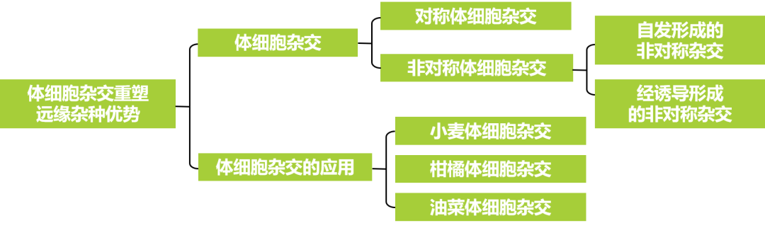 非对称体细胞杂交常产生非对称杂种和胞质杂种。非对称杂种包含受体亲本完整的核基因组 + 供体亲本的部分核基因组(少量染色体或染色体片段),同时可能包含双亲的细胞质成分(叶绿体、线粒体),利用非对称杂种可以突破“远缘杂交伴随大量不良基因”的瓶颈,实现精准渐渗育种;胞质杂种包含受体亲本的完整核基因组 + 供体亲本的细胞质基因组(叶绿体和/或线粒体),此种杂种形式下供体核基因组完全丢失,利用胞质杂种可以解决“有性杂交中细胞质仅母系遗传”的限制,快速创建新型不育系或抗性种质。