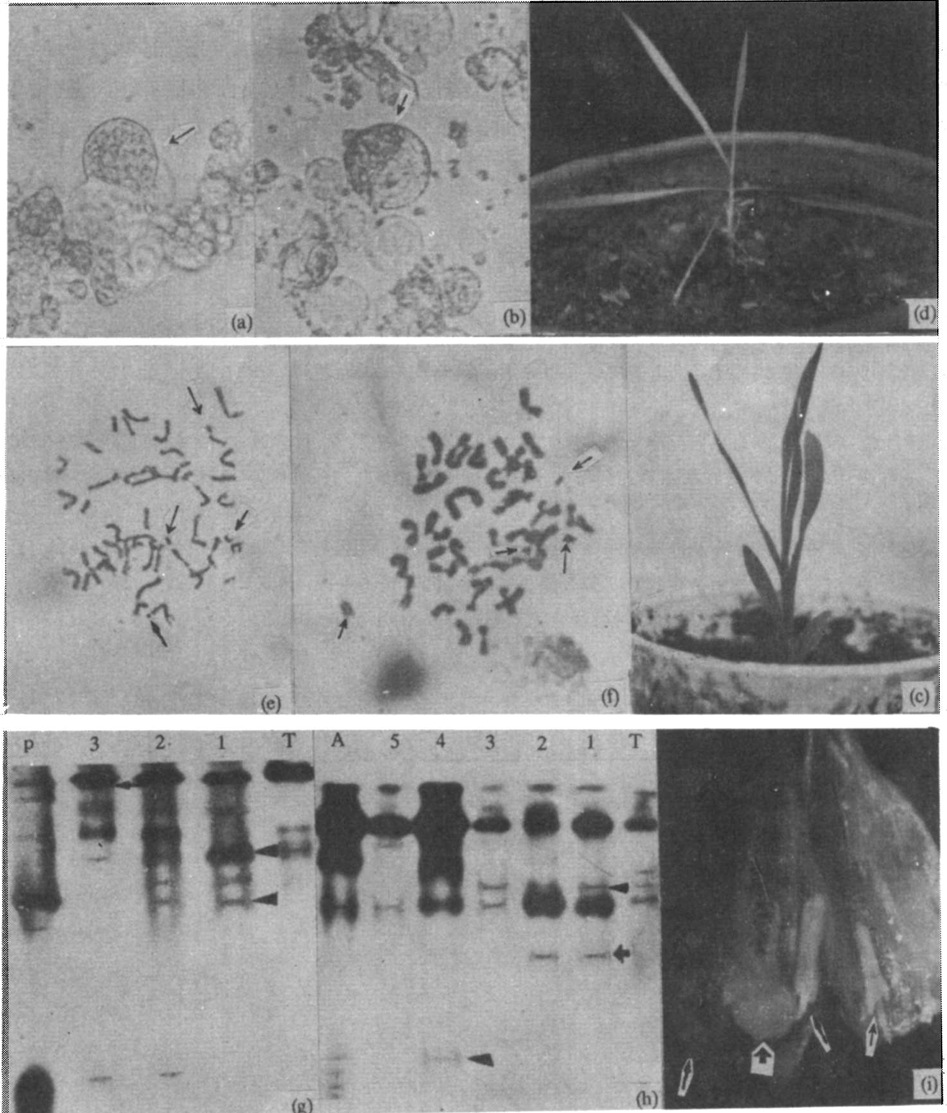 图3 小麦与新麦草及高冰草属间不对称体细胞杂交的再生植株(夏光敏等,1996)。(a)小麦与高冰草原生质体经融合处理形成的异源二聚体,↑指向高冰草原生质体;(b)↑指向小麦(+)高冰草原生质体异源融合体;(c)小麦(+)新麦草融合再生植株;(d)小麦(+)高冰草融合再生植株;(e)小麦(+)新麦草杂种3号植株根尖染色体,↑指向断裂染色体片段;(f)小麦(+)高冰草杂种2号克隆植株根尖杂色体,↑指向断裂染色体片段;(g)小麦(T),新麦草(P)及杂种1~3号植株过氧化物酶同工酶谱,▲指向特异带;(h)小麦(T),高冰草(A)及杂种1~5号克隆再生植株过氧化物酶同工酶谱,▲指向特异带,↑指向新带;(i)小麦(+)新麦草杂种植株的一朵花,↑指向具有3个柱头的雌蕊和花药。
