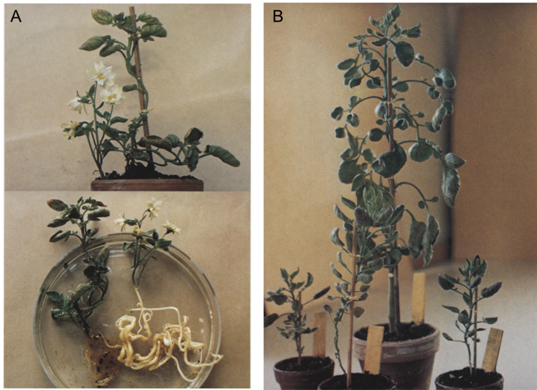 最具有代表性的案例是,1978年,德国科学家Melchers等人发表在Carlsberg Research Communications杂志上一篇题为“Somatic hybrid plants of potato and tomato regenerated from fused protopplasts”的研究论文,该研究将马铃薯和番茄的原生质体进行融合,期望得到地上结番茄,地下长土豆的马铃薯番茄(Potato-tomato),然而结果并非如预期的那样。