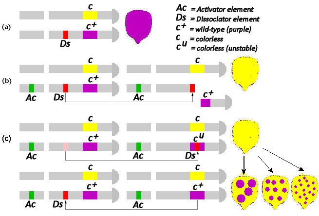 如图3所示,在Ac(自主转座子)不存在的情况下,Ds(非自主转座子)无法移动,因此无法影响到调控籽粒颜色的基因。而紫色基因(c+)相对于无色基因(c)为显性,因此图3A中的杂合体表型为紫色。当Ac存在时,Ds被激活,其可以插入到c+基因中,如果此时Ds的插入导致了染色体的断裂,那么在子代中c+基因功能的丧失就是不可逆的,最终形成了黄色的籽粒(图3B)。当Ds的插入没有导致染色体的断裂,那么子代中Ds还可以再通过Ac被移动出c+,导致部分细胞中c+功能正常,部分细胞中c+功能丧失,出现斑点色的籽粒(图3C)。