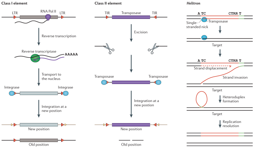 在另一种分类标准下,根据转座方式的不同,转座子又可以被分成I型转座子(Class I element),II型转座子(Class II element)以及Helitron转座子。