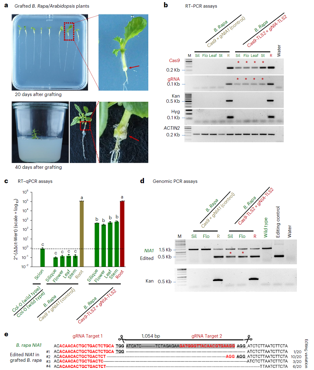 Yang L, Machin F, Wang S, et al. Heritable transgene-free genome editing in plants by grafting of wild-type shoots to transgenic donor rootstocks[J]. Nature Biotechnology, 2023, 41(7): 958-967.