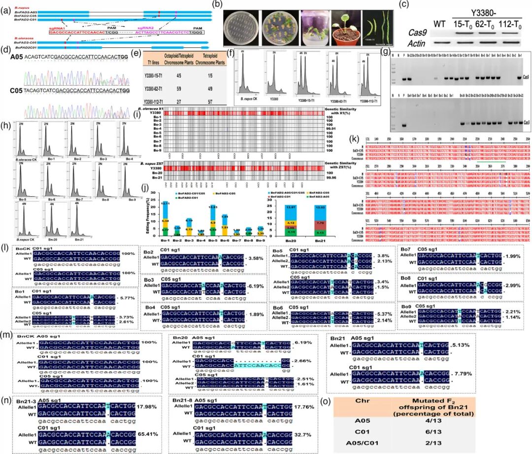 图4 双单倍体诱导系介导的甘蓝和油菜中的多个同源基因的基因编辑(Li et al., 2021)。(a)设计了两个sgRNA用于靶向两个BoFAD2和三个BnFAD2同源基因的保守区;(b)Y3380的遗传转化;(c)RT-PCR分析三个转基因Y3380植株中的Cas9表达;(d)评估该CRISPR/Cas9系统在Y3380-15的T0植物中的功效;(e、f)Y3380-15、Y3380-62和Y3380-112的T1植物的流式细胞术分析;(g)使用Cas9特异性引物通过PCR检测筛选不含CRISPR/Cas9载体的后代;(h)双单倍体植株的DNA定量;(i)使用Bnapus 50K Illumina Infinium SNP 阵列对9个B.oleracea和2个B.napus后代进行基因分型分析;(j)对B.oleracea和B.napus双单倍体后代的不同FAD2同源基因中发生的编辑频率进行统计分析;(k)通过TA克隆方法验证Hi-Tom测序结果;(l-o)对B.oleracea(l)、B.napus(m)和F2代Bn-21(n)中Y3380-CRISPR/Cas9诱导的突变进行Hi-Tom测序分析。