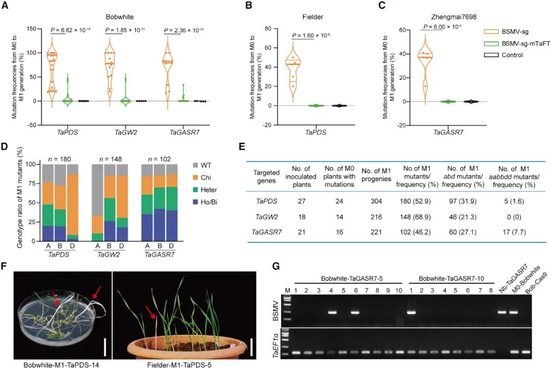 图8 使用BSMV-sg在三个小麦品种中进行可遗传编辑(Li et al., 2021)。(A-C)比较BSMV-sg和BSMV-sg-mTaFT载体在(A)Bobwhite的TaPDS、TaGW2和TaGASR7靶位点处,(B)Fielder的TaPDS靶点处,(C)郑麦7698的TaGASR7靶点处的可遗传编辑效率;(D)TaPDS、TaGW2和TaGASR7的M1突变体中三种不同突变类型的相对比例;(E)侵染外植体的数量和三个靶基因中M1子代的诱变频率;(F)Bobwhite-M1-TaPDS-14和Fielder-M1-TaPDS-5的表型,白化芽用红色箭头表示;(G)利用RT-PCR检测突变体M1代植株中的BSMV。
