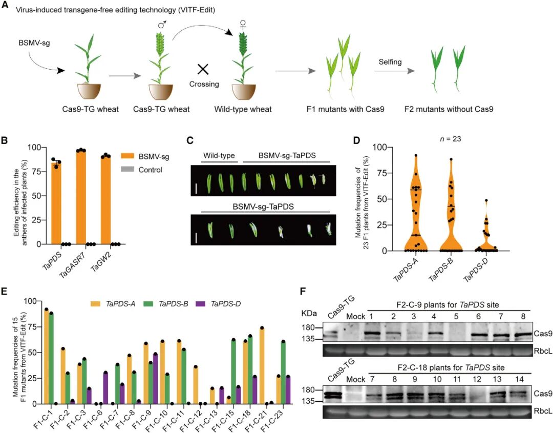 由于BSMV载体容量有限,难以容纳编码Cas9蛋白的核酸序列。因此,该系统需要使用稳定表达Cas9基因的受体植株,为了将Cas9快速的分离出去,作者还开发了一种病毒诱导的无转基因编辑技术(VITF-Edit),通过将BSMV侵染的Cas9转基因小麦花粉与野生型小麦进行杂交,从而生成不含转基因成分的小麦突变体(图9)。