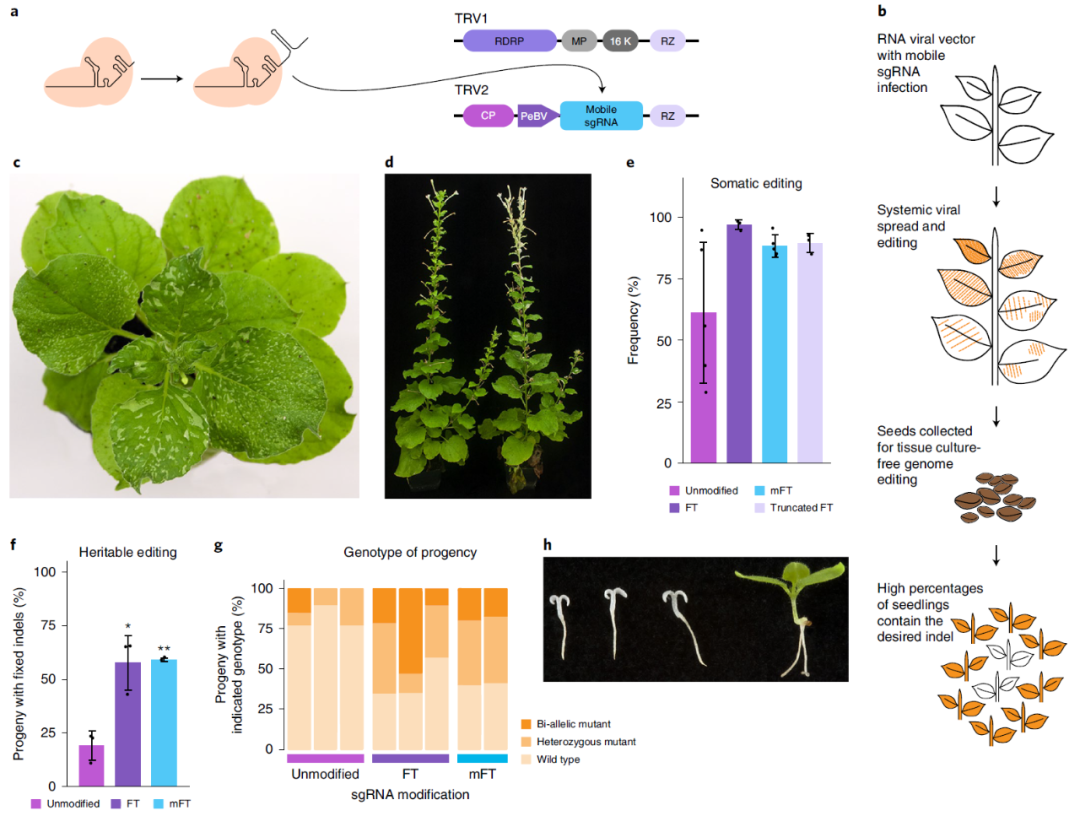图5 使用TRV载体表达可移动的sgRNA进行可遗传的基因编辑(Ellison et al., 2020)。(a)TRV载体示意图;(b)利用改造后的TRV载体进行基因编辑的实验操作流程;(c)农杆菌侵染后约2.5周的本氏烟植株的表型;(d)农杆菌侵染后约10周的本氏烟植株的表型,左侧为对照组,右侧为实验组;(e)靶向PDS的移动sgRNA在侵染叶片上方第八片叶子中的编辑效率的统计结果;(f)PDS基因突变在后代中遗传情况;(g)与普通的sgRNA相比,可移动的sgRNA可以产生更高比例的双等位基因突变和杂合突变;(h)本氏烟幼苗的PDS基因编辑表型;mFT:突变的FT,Truncated FT:截短的FT。