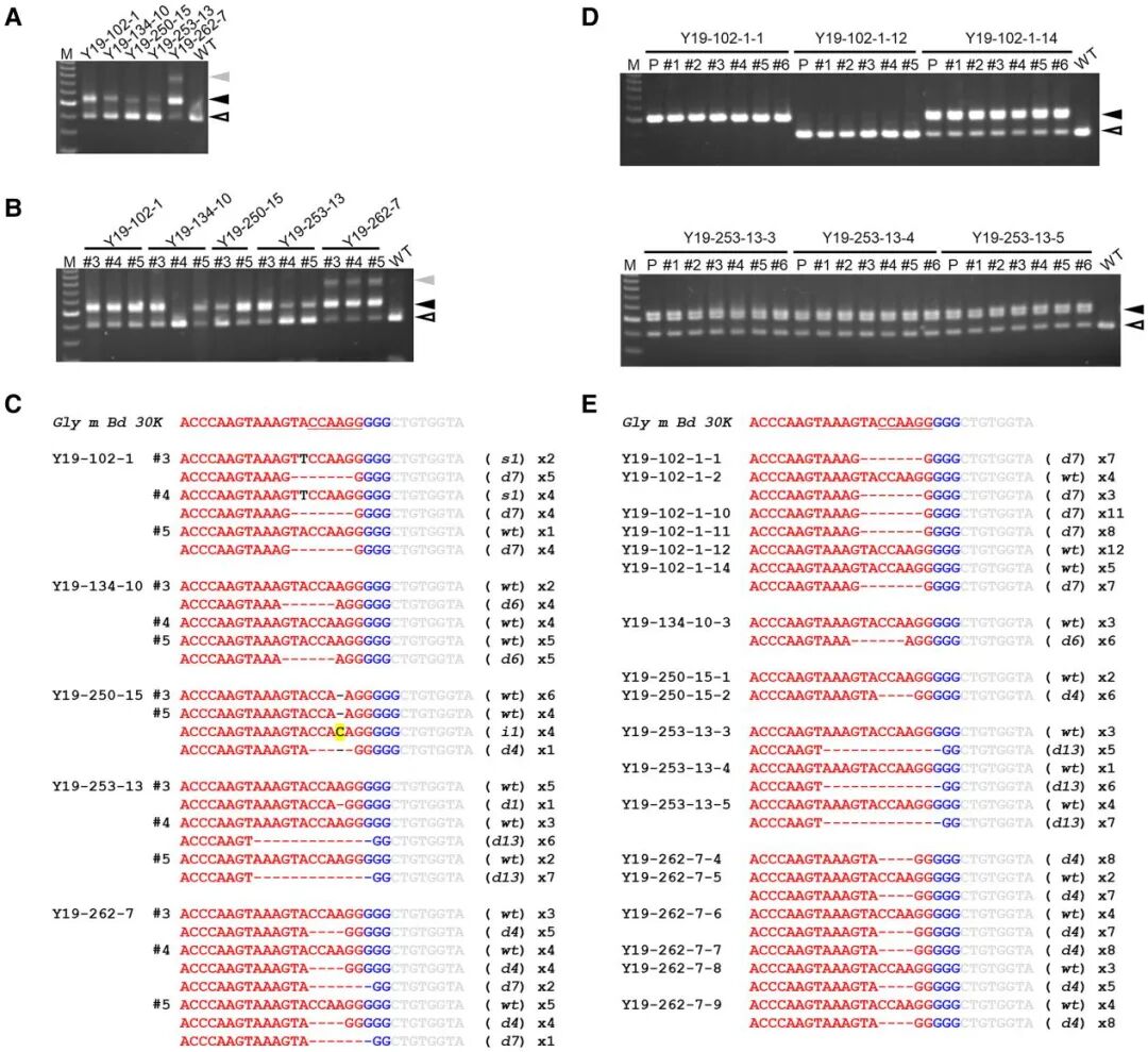 图11 利用CAPS和测序分析检测E0和E1植株的突变情况(Kuwabara et al., 2024)。(A、B、D)CAPS分析:E0叶片中的大量DNA的CAPS分析(A);E0(B)和E1(D)叶片中的单个DNA分析;(C、E)测序分析:E0(C)和E1(E)植物中靶标及附近区域的测序分析。