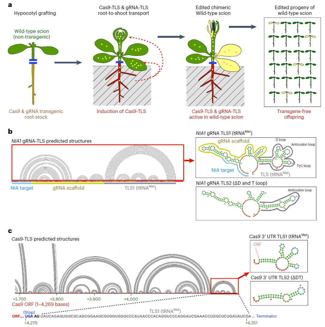 图1 可移动的CRISPR-Cas9介导的基因编辑方法概览(Yang et al., 2023)。(a)“嫁接-移动”基因编辑系统的操作流程;(b、c)根据共转录折叠预测的gNIA1-TLS和Cas9-TLS的RNA的折叠结构,红色框表示论文中使用的TLS基序。