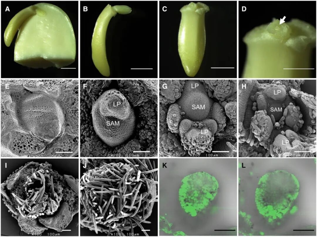 图10 大豆下胚轴的SAM和Cas9蛋白递送的可视化(Kuwabara et al., 2024)。(A-D)大豆下胚轴,白色箭头指示的是SAM;(E-J)茎尖的扫描电镜结果,去除单叶后,大豆SAM在两天内形成了单个叶原基(LP)(F),随后又形成了其它的叶原基,之后毛状体开始覆盖SAM(I、J);(K、L)茎尖共聚焦激光扫描显微镜拍摄的结果,通过观察GFP荧光定位来确定金颗粒的输送。