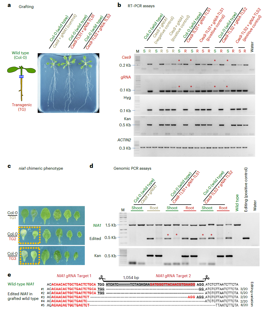 图2 Cas9-TLS和gNIA1-TLS可以从根部移动到接穗中对NIA1进行编辑(Yang et al., 2023)。(a)嫁接三周后从培养基中收集拟南芥地上部(S)和根(R)的样品;(b)RT-PCR检测转基因根和野生型接穗中Cas9与gNIA1的转录情况;(c)嫁接植物中嵌合突变体nia1叶片的褪绿表型;(d)利用基因组PCR检测NIA1编辑片段,标有星号的PCR扩增表示野生型接穗中CRISPR-Cas9成功诱导突变;(e)利用Sanger测序进一步证实了移动的CRISPR-Cas9成功实现了基因编辑。