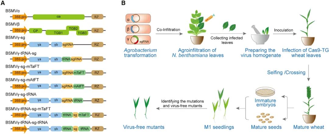 2021年7月,中科院遗传发育所王延鹏课题组和中国农业大学张永亮课题组联合在Molecular Plant杂志上发表了一篇题为“Highly efficient heritable genome editing in wheat using an RNA virus and bypassing tissue culture”的研究论文,该研究设计了一种基于BSMV的sgRNA递送载体BSMV-sg,在小麦中成功建立了高效、可遗传、不需要组织培养的基因编辑元件递送系统。