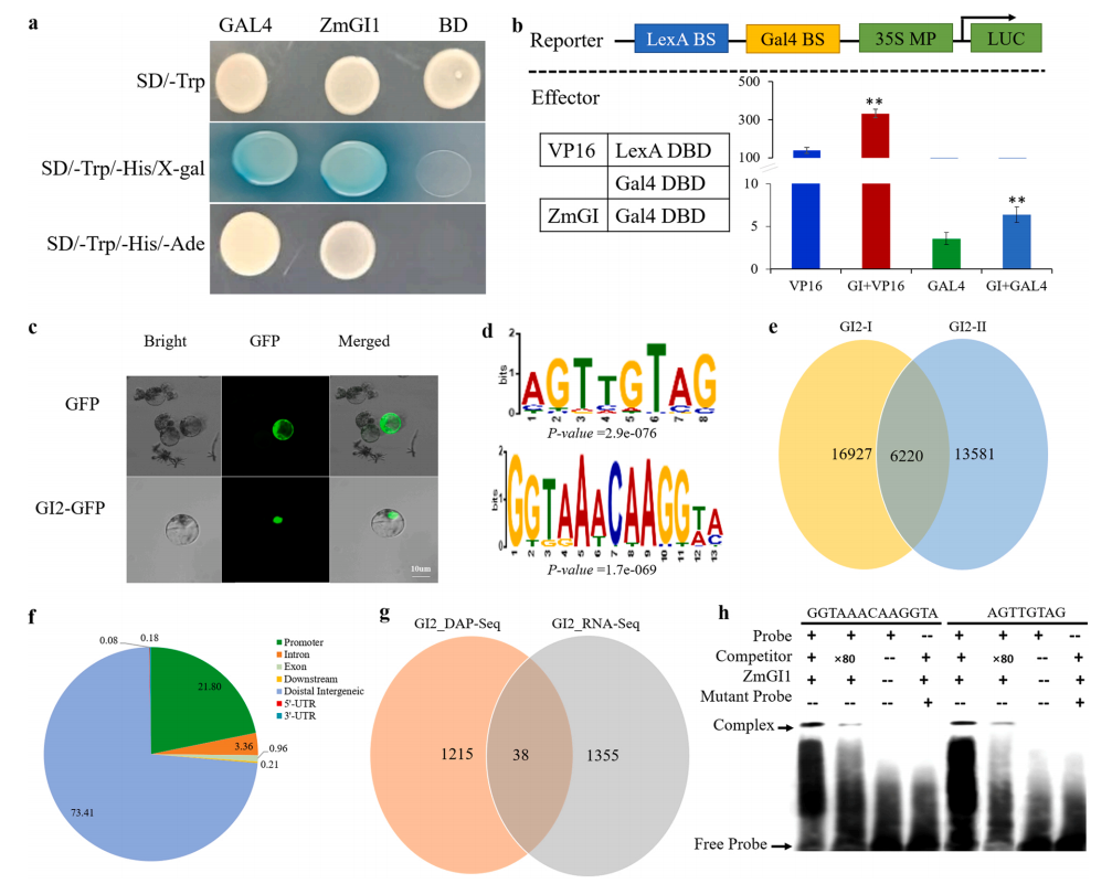 图4 DAP-seq技术分析ZmGI2的结合位点(Li et al., 2023)。(a)ZmGl2在酵母中的转录活性分析;(b)使用Gal4/UAS系统对ZmGI2的转录活性进行瞬时测定;(c)在玉米原生质体中瞬时表达ZmGI2-GFP融合蛋白的核定位;(d)ZmGI2的两个结合基序;(e)两个生物学重复的结合峰数量;(f)ZmGI2结合位点在玉米基因组中的分布;(g)DAP-seq和RNA-seq结果之间的重叠基因;(h)EMSA结果证实ZmGI2与GGTAAACAAGGTA和AGTTGTAG体外结合。