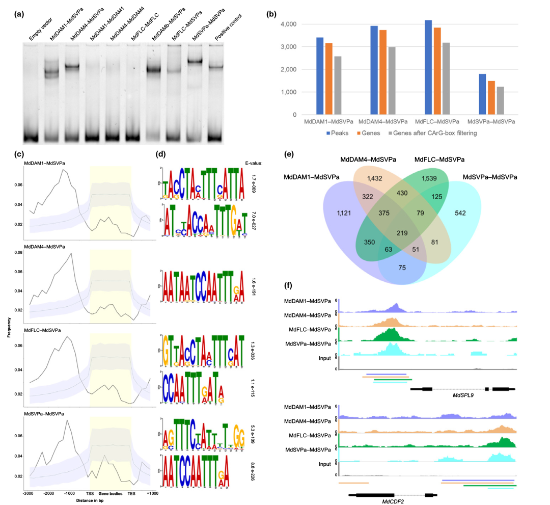 图8 含有MdSVPa转录复合体的全基因组结合位点(da et al., 2021)。(a)EMSA评估MADS同源二聚体和异源二聚体识别DNA探针的能力;(b)seq-DAP-seq结合峰数量、与结合峰相关联的基因数量、至少存在一个MADS转录因子主要结合基序CArG-box的基因数量;(c)转录起始位点(TSS)上游3kb至转录终止位点(TES)下游1kb区域的峰值分布;(d)通过MEME分析的四种MADS复合体结合基序;(e)四种MADS复合体结合的靶基因韦恩图;(f)四种MADS复合体在MdSPL9和MdCDF2启动子区域的DNA结合图谱