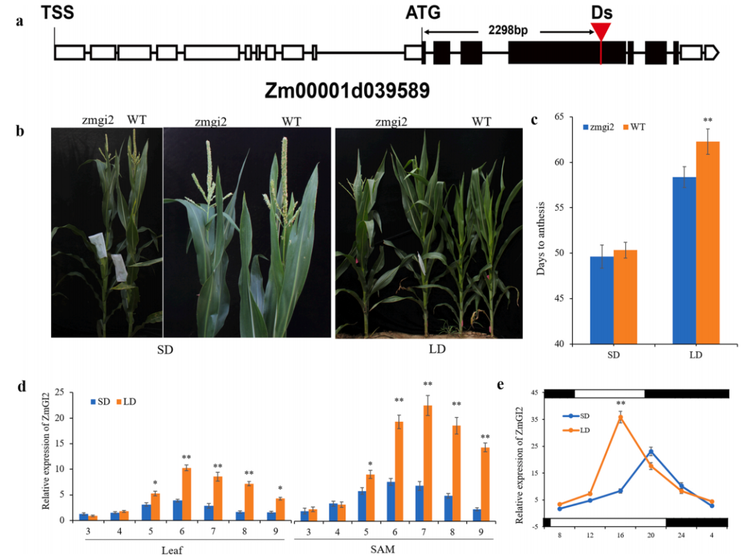 图3 ZmGI2调控玉米开花时间(Li et al., 2023)。(a)zmgi2突变体中Ds转座子插入位置的示意图;(b)在LD和SD条件下zmgi2突变体和WT植株的表型;(c)在LD和SD条件下zmgi2突变体和WT植株开花的天数;(d)ZmGI2在第3至第9片完全展开的叶片和茎尖分生组织(SAM)中的表达模式;(e)ZmGI2在SAM中的表达显示出昼夜节律。
