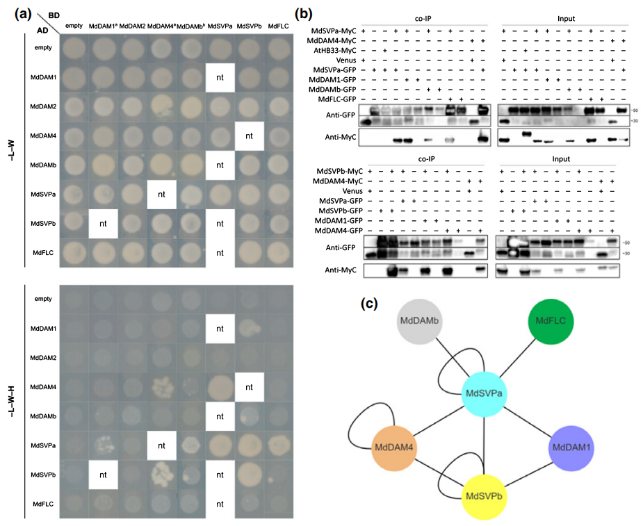作者通过酵母双杂交实验(Y2H)和免疫共沉淀实验(Co-IP)证明苹果DAM-、FLC-和SVP-like蛋白之间存在一个以MdSVPa为中心的相互作用网络(图7)。