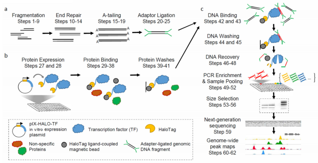 (3)亲和纯化及测序:将纯化后的转录因子和亲和标签融合蛋白与基因组DNA文库共同孵育,融合蛋白能与基因组DNA片段上的特定序列结合。通过使用Halo Tag特异性磁珠,将目的蛋白和DNA复合物进行提取和纯化,然后对捕获的DNA片段进行PCR扩增,并利用Illumina测序平台进行测序;