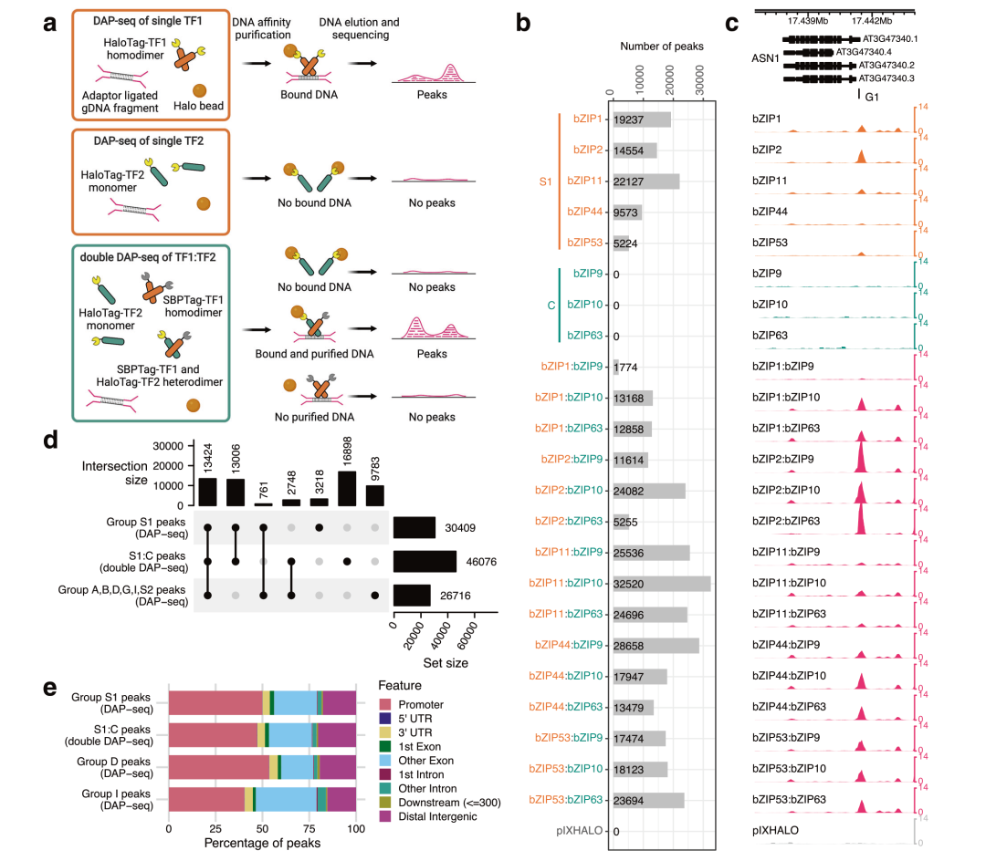 图9 通过DAP-seq和dDAP-seq鉴定C/S1 bZIPs同源二聚体和异源二聚体结合位点(Li et al., 2023)。(a)DAP-seq和dDAP-seq实验流程示意图;上图:在DAP-seq中,体外表达的Halo Tag-TF1形成同源二聚体,与连接Illumina测序接头的基因组DNA片段结合。TF-DNA复合物由Halo Tag配体耦联磁珠纯化,结合的DNA从磁珠中洗脱并测序。将测序读数与参考基因组进行比对,可将TF结合位置识别为显著读数富集的峰值区域。中图:对本身不能结合DNA的TF进行DAP-seq测序不会产生任何峰值。下图:在dDAP-seq中,分别与SBP Tag和Halo Tag融合的两个TF(SBP Tag-TF1和Halo Tag-TF2)在体外共同表达并形成异源二聚体。Halo Tag配体偶联磁珠用于纯化SBP Tag-TF1:Halo Tag-TF2与结合DNA复合物。虽然磁珠可以吸附Halo Tag-TF2单体,但在没有结合DNA的情况下,将检测不到它们的峰值;(b)通过DAP-seq和dDAP-seq检测到的所有C/S1 bZIPs的峰数量;(c)C/S1 bZIPs同源二聚体和异源二聚体在已知靶基因ASN1(AT3G47340)上的DAP-seq和dDAP-seq结合图谱;(d)比较S1同源二聚体、S1:C异源二聚体和A组、B组、D组、G组、I组、S2组bZIPs之间结合峰数量;(e)bZIP同源二聚体和异源二聚体的结合位点在基因组上的分布。