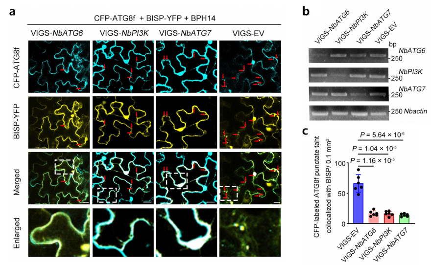 图7 NbATG6、NbPI3K或NbATG7的沉默抑制了CFP-ATG8f标记的自噬点的产生(Guo et al., 2023)。(a)CFP-ATG8f标记的自噬点结构与BISP-YFP共定位的共聚焦图像。CFP-ATG8f、BISP-YFP和BPH14在沉默叶片(VIGS-NbATG6、VIGS-NbPI3K和VIGS-NbATG7)或非沉默对照叶片(VIGS-EV)中瞬时共表达。红色箭头表示CFP-ATG8f标记的自噬点与BISP-YFP共定位。(下)显示放大后的自噬小体图像;(b)通过半定量RT-PCR检测NbATG6、NbPI3K和NbATG7的转录水平。NbACTB转录水平作为对照;(c)沉默和对照叶片中CFP-NBATG8标记的自噬点的平均数量。
