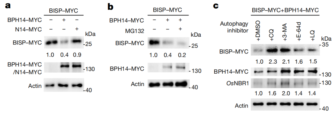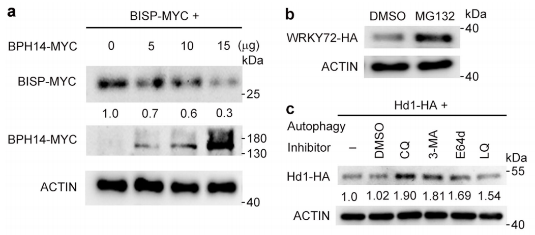 图5 (a)水稻原生质体中BPH14对BISP含量的影响。在水稻原生质体中BISP-MYC单独表达或与BPH14-MYC一起共表达。分别用抗MYC抗体和抗ACTIN抗体检测总蛋白。(b)免疫印迹显示,MG132处理阻断了WRKY72-HA的蛋白酶体降解。分别用抗HA和抗ACTIN抗体检测原生质体总蛋白。(c)免疫印迹显示,自噬抑制剂可阻断Hd1-HA的自噬降解。分别用抗HA和抗ACTIN抗体检测原生质体总蛋白(Guo et al., 2023)。