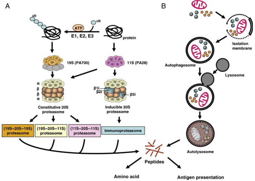 自噬(Autophagy)和泛素-蛋白酶体系统(Ubiquitin-proteasome system, UPS),是细胞内蛋白降解的两个主要途径(图1)。自噬,字面意思就是“自己吃自己”,它在降解细胞内细胞器和较稳定蛋白上起着重要的功能,而UPS则负责特异性地降解大多数细胞内蛋白,是一种蛋白高效降解途径,具有广泛的生物学作用。另外,自噬参与了许多重要的生理和病理过程,成为近年来分子生物学发展最快的领域之一。