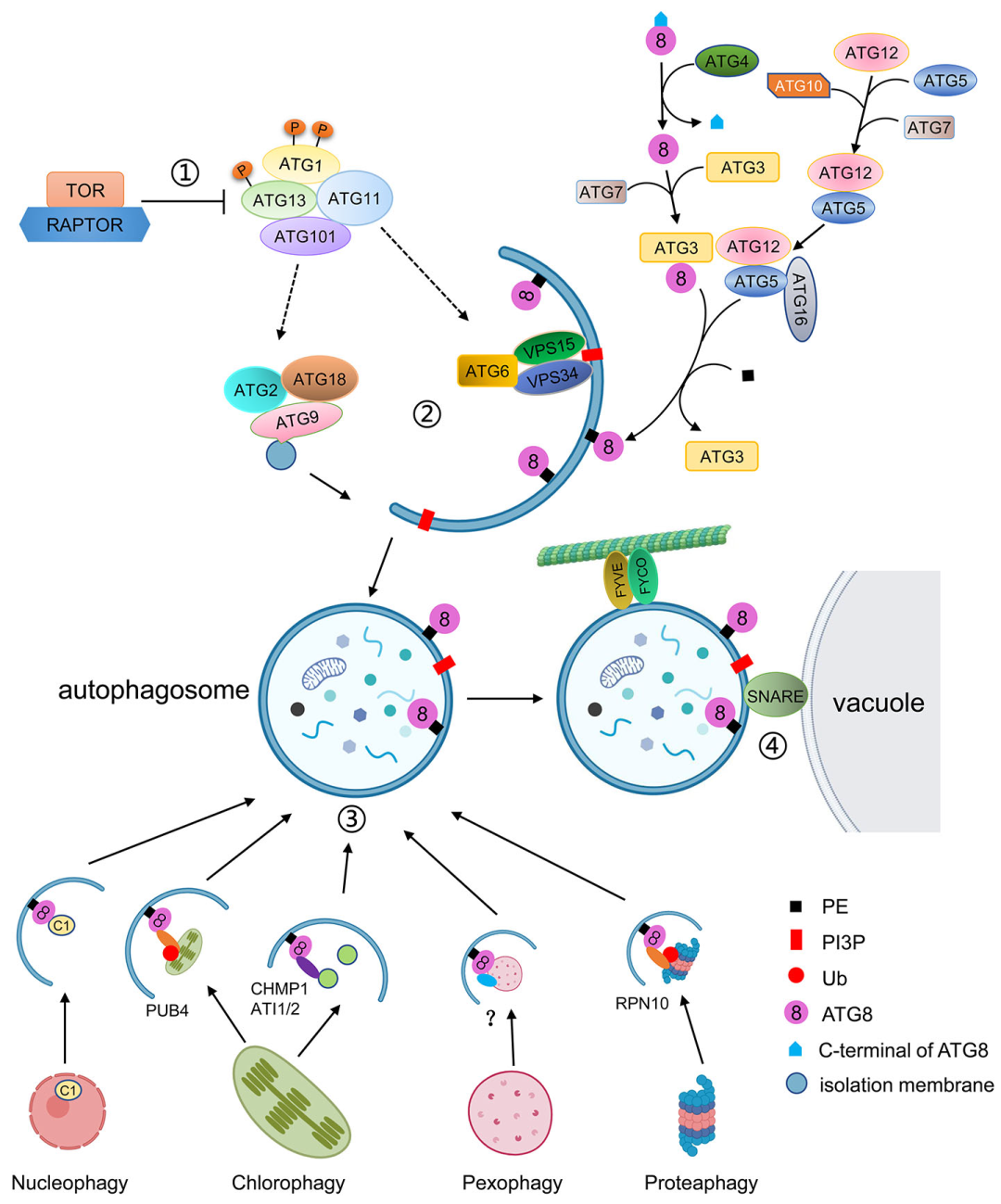 图3 自噬过程示意图(Mitou et al., 2009)。①自噬受TOR激酶调控。抑制TOR可激活组成型自噬,而过表达TOR可阻断自噬。自噬是由ATG13和ATG1结合ATG11和ATG101形成活性复合物而引发的。②自噬体的形成包括膜传递、囊泡成核和吞噬细胞的扩张和闭合。ATG9与ATG2和ATG18一起,参与将脂质传递到不断扩张的吞噬细胞。VPS34脂质激酶复合物产生PI3P修饰,并伴随ATG8与PE(磷脂酰乙醇胺)的偶联。ATG8首先被ATG4裂解其C端而成熟,然后被类似E2的ATG3和类似E3的ATG12-ATG5-ATG16复合物偶联至PE。ATG8-PE定位于自噬体膜,用于吞噬细胞扩张。③选择性自噬是由ATG8通过AIM结构域与特异性自噬受体相互作用介导的。不同的细胞成分可以被特定的自噬受体识别。例如,C1蛋白从细胞核转移到细胞质,并与ATG8结合降解。整个叶绿体被PUB4泛素化,并与ATG8结合。叶绿体片段被CHMO1或ATI1/2识别,并被RCBs或ATI1/2修饰的质体降解。在植物中,被降解的过氧化物酶体可能被PEX6或PEX10识别,而泛素化的蛋白酶体可被RPN10识别。④成熟的自噬体在FYVE和FYCO蛋白的帮助下被运输到液泡中,并与液泡融合进行降解。