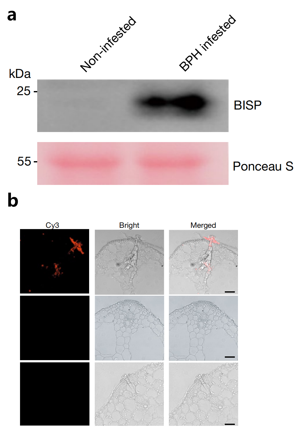 图9(a)在BPH侵染期间,BISP被输送到水稻叶鞘中。用抗BISP抗体分析叶鞘蛋白。Ponceau S染色作为上样对照;(b)免疫组化染色显示受BPH感染的水稻叶鞘中的BISP。用抗BISP抗体检测未感染(中)和感染BPH(下)的鞘,免疫前兔血清检测作为阴性对照(Guo et al., 2023)。